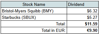 Similar to what happened in August this year, dividend income is lower than last year once everything is converted into euros. While both Bristol-Myers Squibb and Starbucks slightly increased their dividends in USD terms, the weaker US dollar meant that I actually received less in euros.