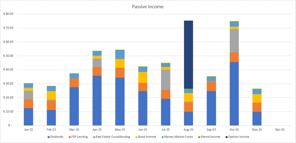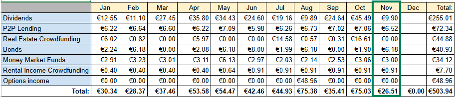After adding everything up, our portfolio generated €26.51 in passive income during November: