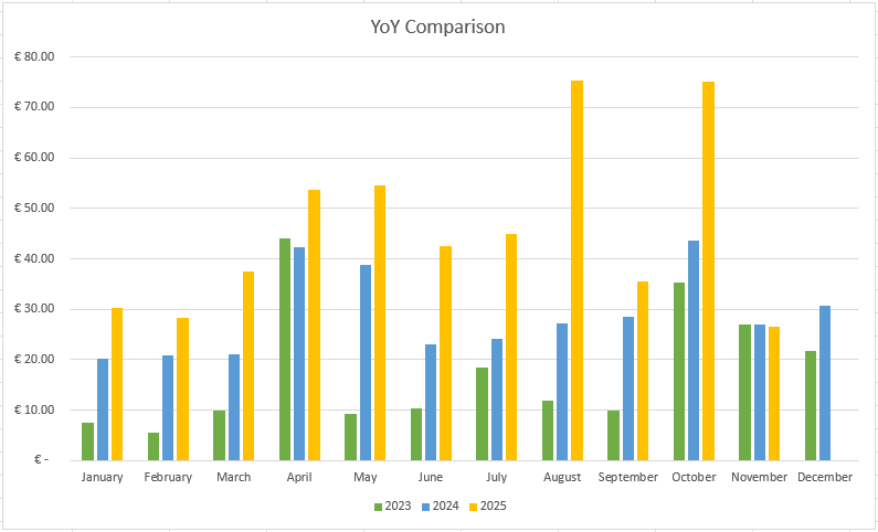 Year to date, our passive income stands at €503.94, which means I officially reached my €500 annual goal with one month still to go. Now let’s see how much higher that number will be once December is counted.